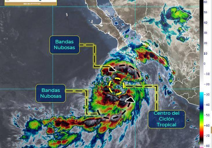 Las bandas nubosas del sistema generarán lluvias muy fuertes a intensas en Baja California Sur, y reforzarán el potencial de lluvias fuertes a muy fuertes en Sinaloa, Durango, Nayarit y Jalisco.