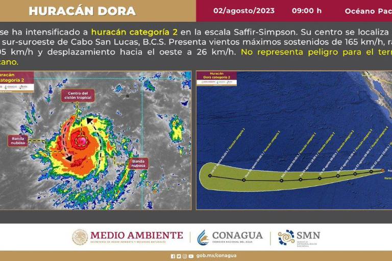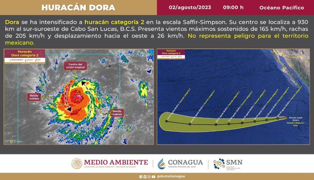 El ciclón Dora se intensificó la mañana de este miércoles a huracán de categoría 2 en la escala de Saffir-Simpson, por la velocidad de sus vientos, y se encuentra lejos del territorio mexicano, informó el Servicio Meteorológico Nacional.