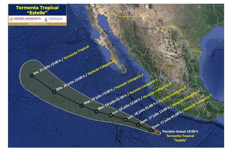 Se prevé que “Estelle” que a medianoche de este sábado se intensifique a huracán categoría 1 y se localice a 462 kilómetros al sur-suroeste de Punta San Telmo, Michoacán.