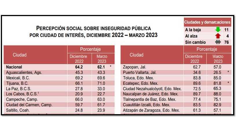 En marzo de 2023, 62.1 por ciento de la población de 18 años de edad y más, residente en 75 ciudades en el País, consideró que era inseguro vivir en su ciudad, lo que representó un cambio estadísticamente significativo con relación a los porcentajes registrados en diciembre de y marzo de 2022, 64.2 y 66.2 por ciento, respectivamente, según lo encontró la Encuesta Nacional de Seguridad Pública Urbana, correspondiente al primer trimestre del presente año publicada por el Instituto Nacional de Estadística y Geografía.