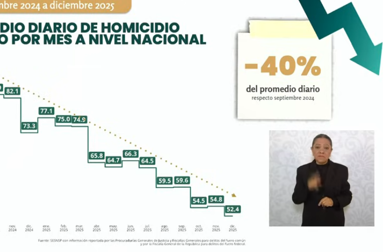 “Los últimos 15 meses han presentado una tendencia sostenida a la baja. La actual administración inició con un promedio de 86.9 homicidios diarios en el país y en diciembre de 2025 cerró con un promedio diario de 52.4”, precisó.