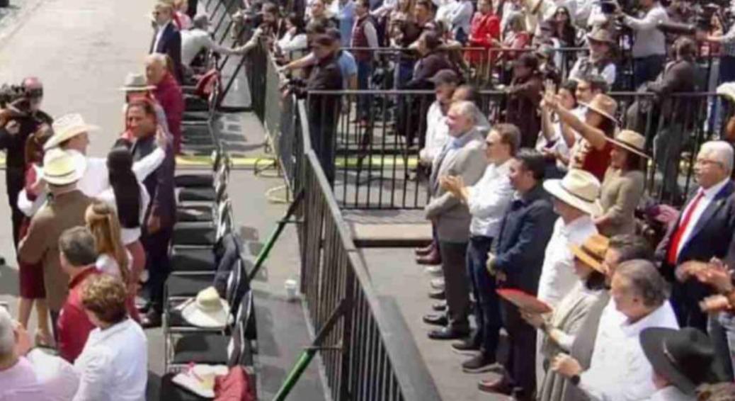 Durante ese mitin, la titular del Poder Ejecutivo Federal pasó sin detenerse frente a líderes de Morena y coordinadores parlamentarios del Congreso de la Unión, momentos antes de iniciar el mensaje que dirigió en el Zócalo capitalino.