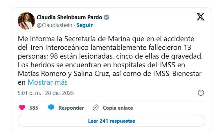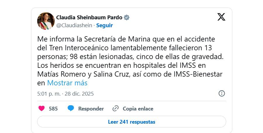 La Presidenta Claudia Sheinbaum Pardo confirmó que el accidente en el Tren Interoceánico dejó un saldo de 13 personas fallecidas y 98 lesionadas.