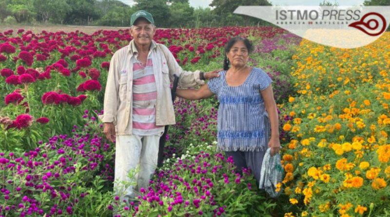 OAXACA.– Es de tarde, el viento sopla ligero y ambos caminan con tranquilidad entre los surcos que parecen un gran jardín pintado de amarillo, guinda y violeta. Victorina Valdivieso González e Isaías Alonso Marín tienen 65 años de edad y desde hace 40 años cultivan flores de muerto “Guie’ biguá (cempasúchil), Guie’ cresta de gallo y guie’ yaana’ (flor de olote)” en familia y por tradición en esta localidad oaxaqueña.