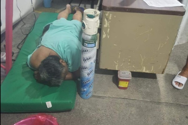 Enfermos tirados en colchonetas en el piso del patio de la clínica, atrás de un viejo escritorio, junto a una papelera de desechos sanitarios, vestidos únicamente con una bata verde, y con un tanque de oxigeno a su lado.