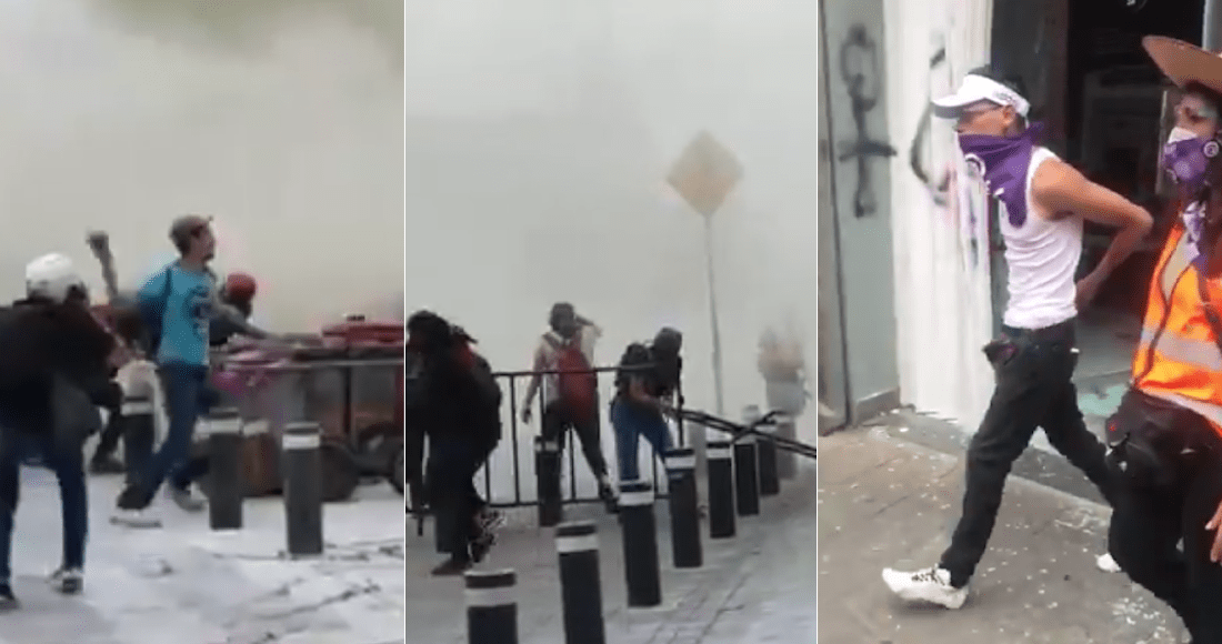 Un video captado cerca del Metro Hidalgo muestra a sujetos arrojando botes de basura y piedras contra las uniformadas, quienes sólo utilizaron extintores para traer de frenar el avance de los agresores.