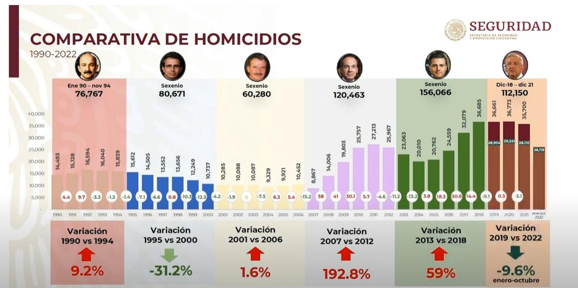 A pesar de ello, durante su conferencia de prensa matutina del 22 de noviembre de 2022 -llevada a cabo desde el Salón Tesorería del Palacio Nacional-, López Obrador destacó que en lo que va de su Gobierno se registró una disminución de 0.4 por ciento en los asesinatos, y de 4.1 por ciento en 2021.