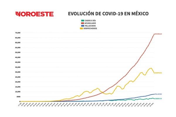 En cuanto a las defunciones, hay 595 “sospechosas”. Además de que hay 2 mil 764 nuevos casos confirmados en 24 horas, lo que representa un 4.2 por ciento de incremento del día anterior, según indicó el funcionario federal, durante la conferencia de seguimiento diario respecto a la pandemia del coronavirus en México.