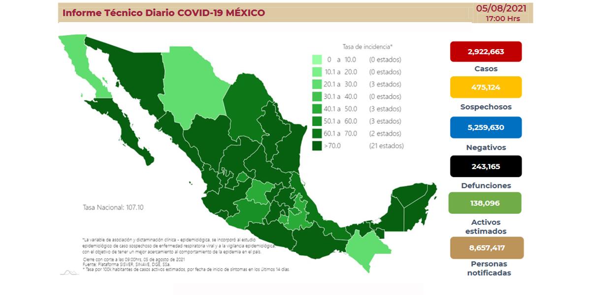 Hasta ahora, 2 millones 922 mil 663 personas han enfermado por el virus, desde el inicio de la epidemia, sin embargo se estima que 138 mil 96 (un 4.4 por ciento) son casos activos por presentar síntomas recientes.