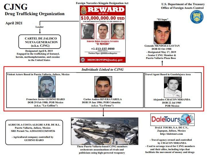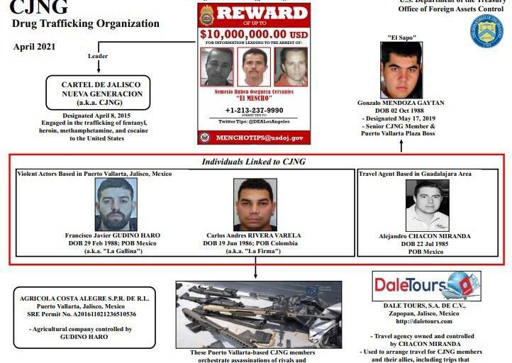 ”Chacón Miranda organiza viajes para los miembros del CJNG y sus aliados, incluidos viajes que facilitan el movimiento de dinero y drogas. [...] es dueño de Dale Tours, una agencia de viajes del área de Guadalajara, que también fue designada hoy, y la usa para brindar servicios a CJNG”, agregó la OFAC.