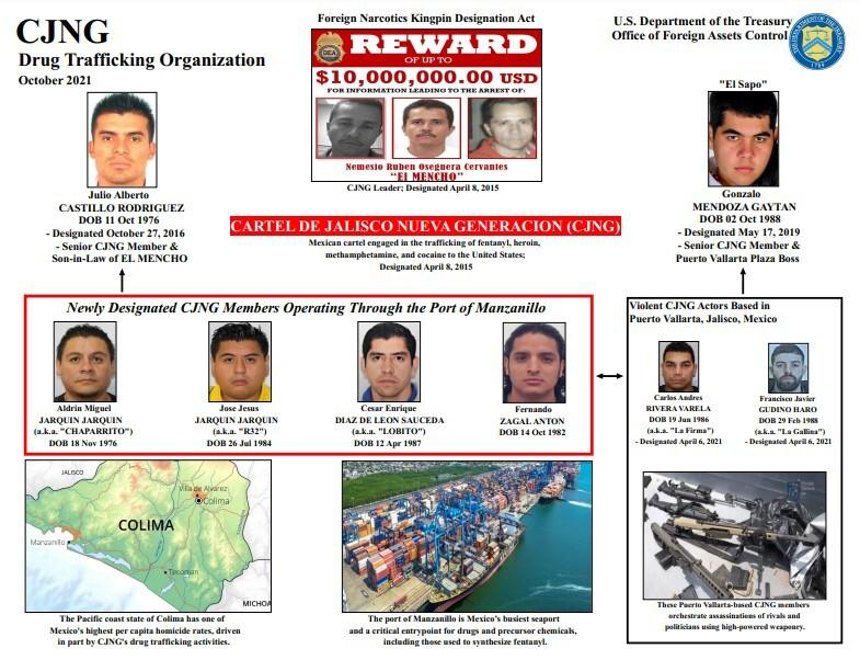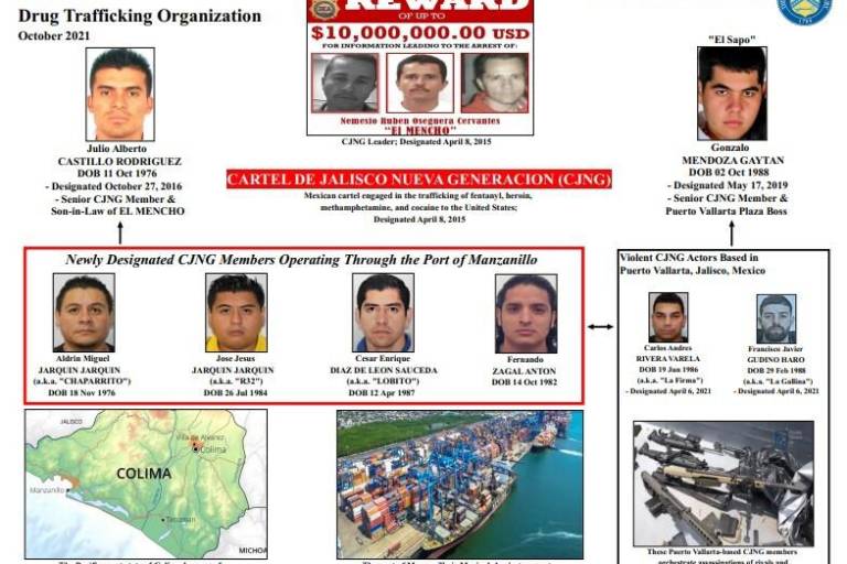 “Estos cuatro individuos son miembros del CJNG que operan a través del puerto de Manzanillo y áreas circunvecinas”, según indicó el Gobierno encabezado por el Presidente Joseph Biden en un comunicado, en cual agregó que dicha organización criminal es responsable de una parte significativa del tráfico de drogas a Estados Unidos.
