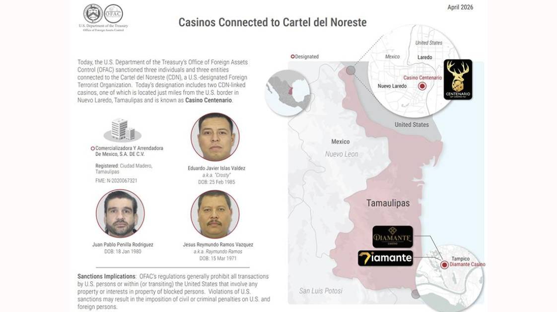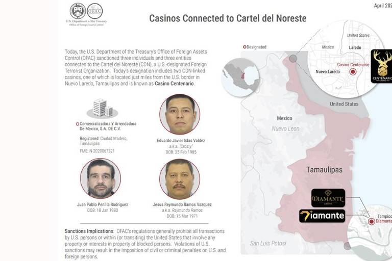 Las sanciones recaen sobre dos casinos, una empresa operadora y tres personas físicas que, según la dependencia federal estadounidense, desempeñan roles centrales en el control que el CDN ejerce sobre la plaza de Nuevo Laredo.