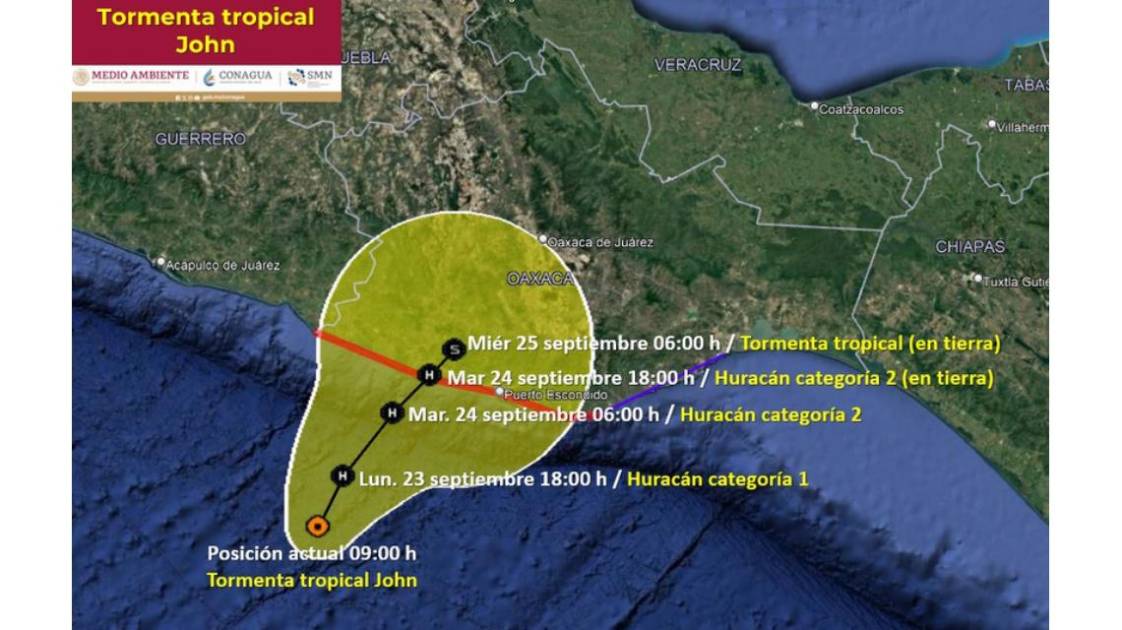 Se espera que para el medio día de hoy 23 de septiembre John esté a 145 km al sur-suroeste de Lagunas de Chacahua, Oaxaca. Mientras que para el medio día del 24 de septiembre podría estar 15 km al oeste-suroeste de Puerto Escondido.