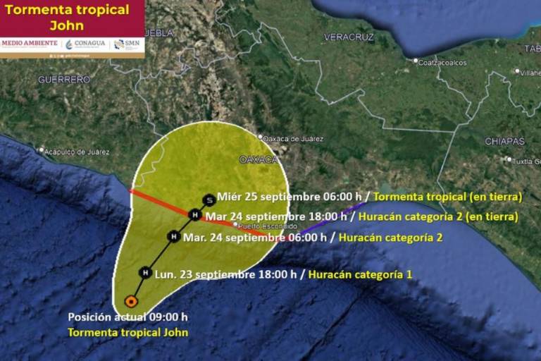 El Servicio Meteorológico Nacional (SMN) informó que la tormenta tropical John se acerca y fortalece con dirección a las costas de Oaxaca. Se pronostica que generará lluvias extraordinarias en la entidad de más de 250 milímetro (mm), así como vientos con rachas de 70 a 90 kilómetros por hora (km/h), oleaje de 2 a 4 metros de altura en las costas.