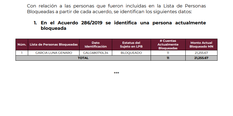 Además, en un informe, el organismo adscrito a la Secretaría de Hacienda y Crédito Público detalló que los desbloqueos en favor de los implicados, en lo que denomina el Caso García Luna, son resultado de sentencias dictadas en 7 juicios de amparo.