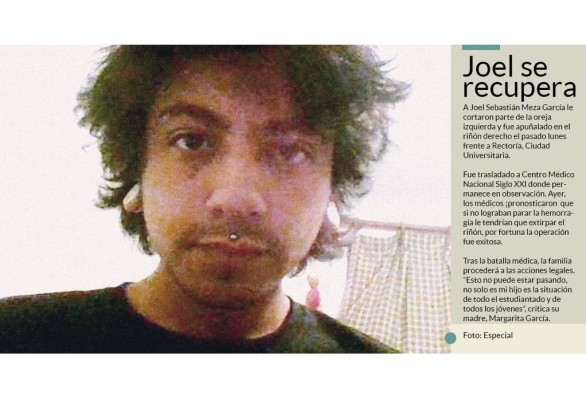 Joel y su novia Naomi salieron de clases y se presentaron en el mitin, “sabían de qué se trataba y se quedaron a escuchar y cuando se levantaron empezaron a llegar estas personas [porros] a golpearlos”, explica Margarita García Severino madre del estudiante.