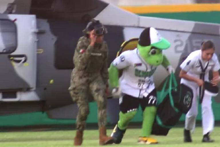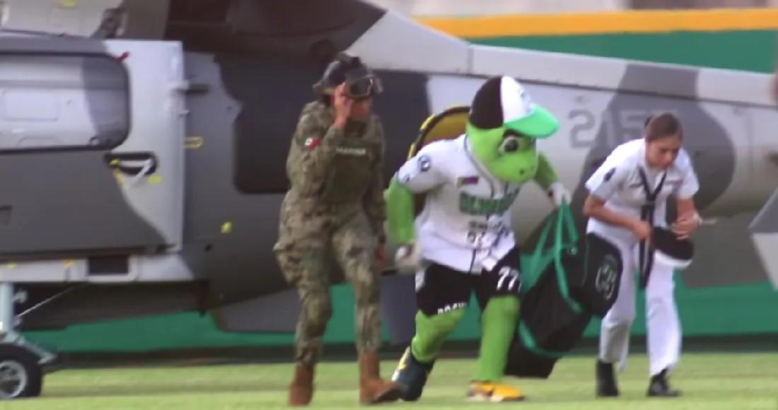 Ayer, previo al partido de eliminatoria de la postemporada de la Liga Mexicana de Béisbol contra los Tigres de Quintana Roo, “Pochi”, como se le conoce a la tortuga mascota, llegó al estadio en un helicóptero Panther de las Fuerzas Armadas junto con uniformados.