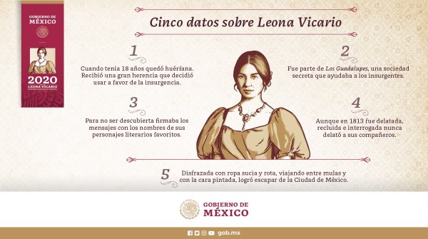 "#LeonaVicario utilizó su fortuna para apoyar la causa independentista y colaboró con sus ideas para periódicos insurgentes. Te compartimos algunos datos de su biografía a propósito de su 178 aniversario luctuoso", tuiteó el Gobierno.