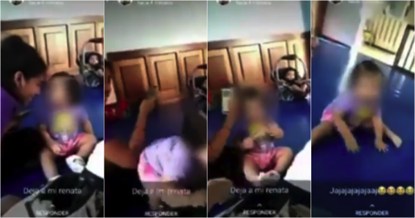 Posteriormente, la supuesta educadora que hizo caer a la pequeña continúa empujándola mientras está sentada en el suelo, en tanto que la persona que está grabando continúa riendo sin detenerla.
