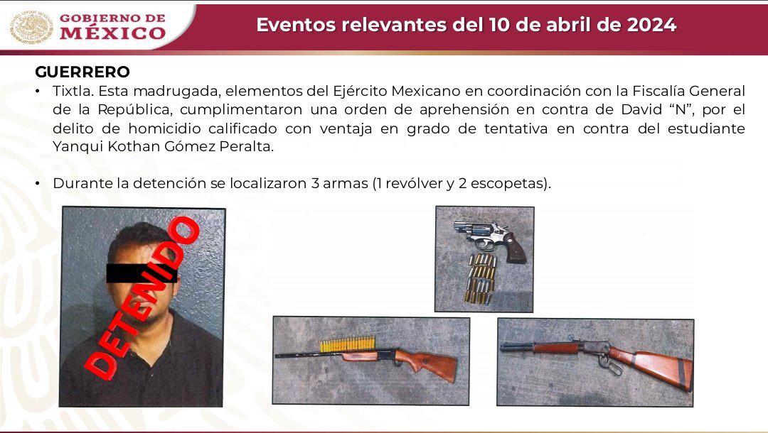 “Esta madrugada elementos del Ejército mexicano en coordinación con la Fiscalía General de la República, cumplimentaron una orden de aprehensión en contra de David ‘N’, por el delito de homicidio calificado con ventaja en grado de tentativa, contra el estudiante Yanqui Kothan Gómez Peralta”, comentó el Presidente.