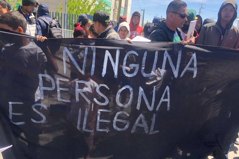 “Queremos que nos atienda, que nos escuche”, demandaban los manifestantes portando entre las manos fotografías de las víctimas y lonas con emblemas como “Ningún ser humano es ilegal” en las inmediaciones del gimnasio del Colegio de Bachilleres de Juárez.