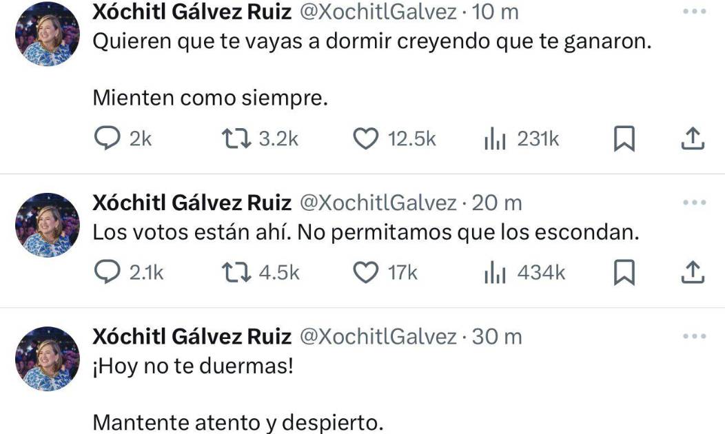 “Quieren que te vayas a dormir creyendo que te ganaron. Mienten como siempre [...] Los votos están ahí. No permitamos que los escondan [...] Mantente atento y despierto”, escribió la política hidalguense y senadora con licencia, en su cuenta de la red social X.