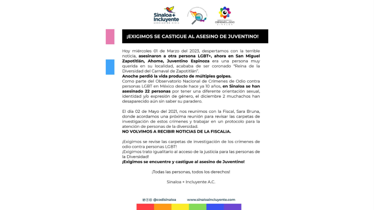 CULIACÁN._ Con unos tacones blancos y la bandera de la comunidad LGBT fue cubierto el ataúd de Juventino, Reina de la Diversidad en la comunidad de San Miguel, en el municipio de Ahome.
