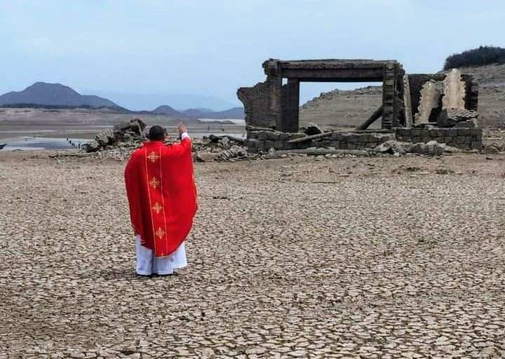 “Volvió a celebrarse la Santa Misa en la antigua Iglesia que está en medio de la presa Miguel Hidalgo, templo en ruinas que en otros tiempos está sumergido en las aguas, pero que hoy está totalmente visible ante la terrible sequía que aqueja a Sinaloa”, se lee en la publicación.