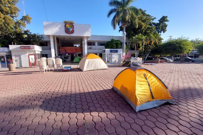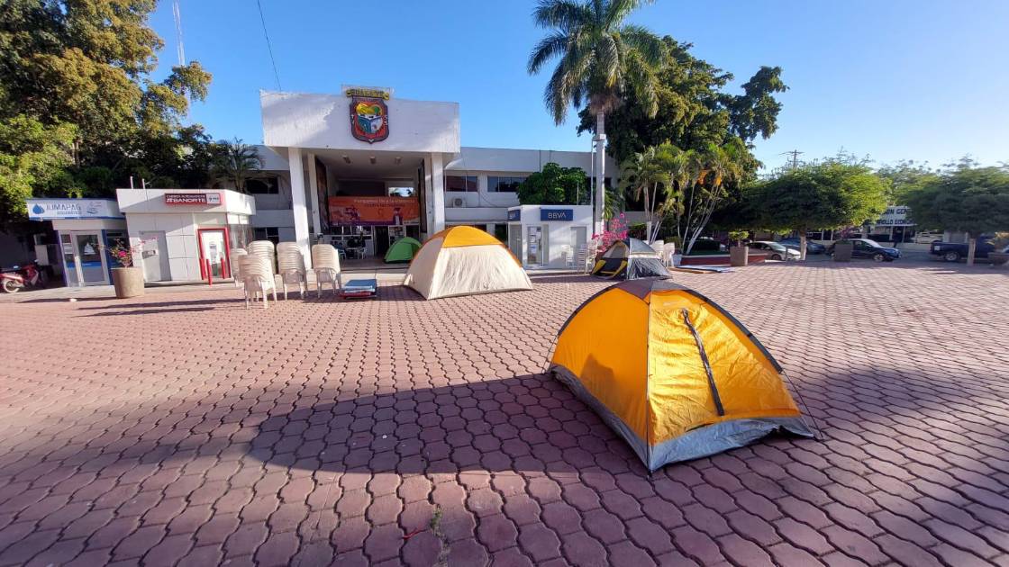 GUASAVE. _ Integrantes del Sindicato de Trabajadores al Servicio del Ayuntamiento de Guasave iniciaron un plantón y pernoctaron en casas de campaña frente al Palacio Municipal, para exigir el aumento salarial de 2021 y 2022 y que se detengan las negociaciones del contrato colectivo de trabajo entre el Municipio y el Sindicato Autónomo de Trabajadores del Ayuntamiento de Guasave.