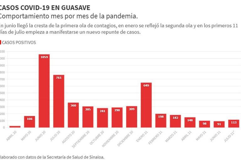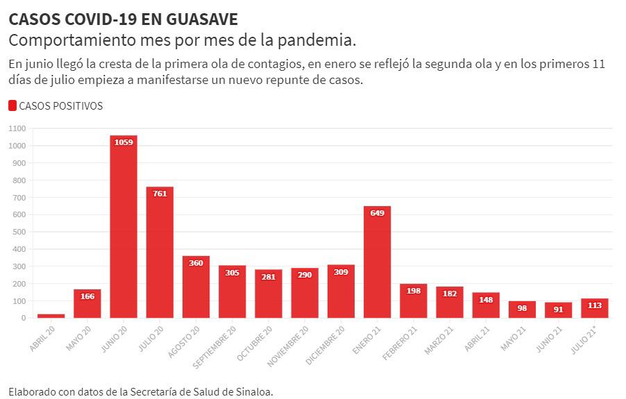 Y es que hasta el corte del sábado, Guasave ya sumaba 113 nuevos casos de coronavirus en los primeros 11 días del mes, sobrepasando el total de pacientes con los que cerraron los meses de mayo y junio.
