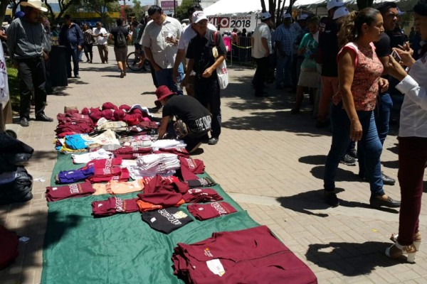 GUAMÚCHIL._ Como un acto inédito en una campaña política, es lo que se está viviendo en la visita de Andrés Manuel López Obrador a Guamúchil, pues ya se instaló un puesto de venta de souvenirs con la marca Morena.