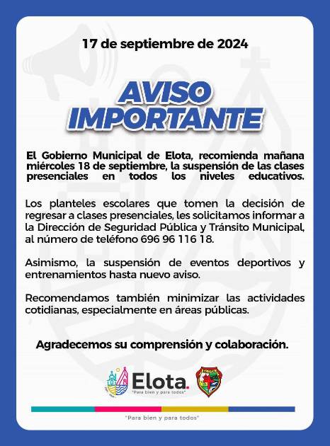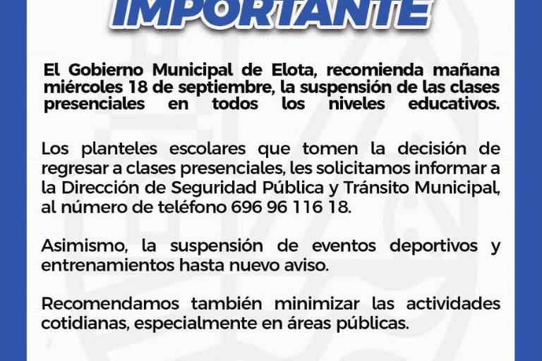 “El Gobierno Municipal de Elota recomienda mañana miércoles 18 de septiembre, la suspensión de las clases presenciales en todos los niveles educativos”, dice.
