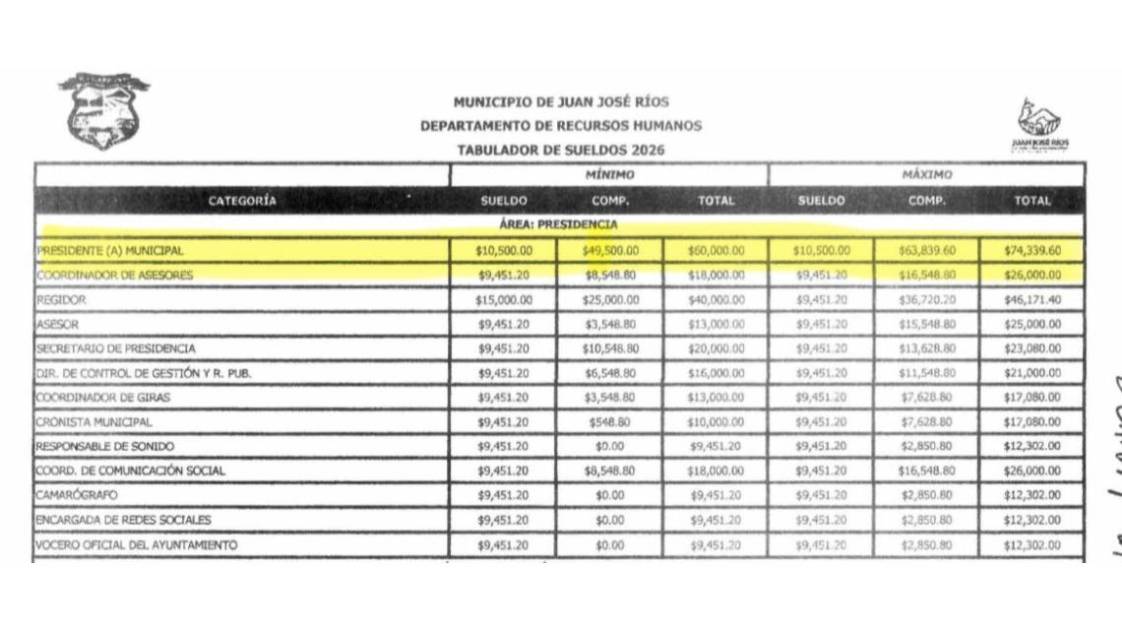 La Presidenta Municipal de Juan José Ríos, Evangelina Llanes Carreón, percibirá en 2026 un sueldo mensual de hasta 74 mil pesos, de acuerdo con el tabulador de remuneraciones aprobado dentro del Presupuesto de Egresos para el segundo año de administración del municipio.