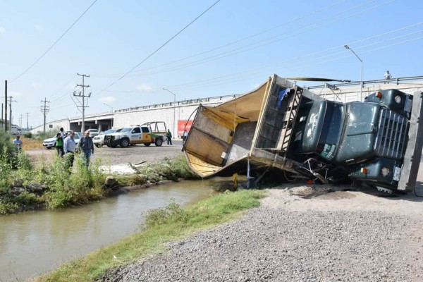 LOS MOCHIS._ Un camión que transportaba fertilizante volcó en un canal que abastece a una planta potabilizadora de la Junta de Agua Potable y Alcantarillado del Municipio de Ahome.