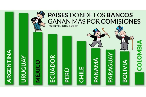 Uruguay es el país donde la banca recibe los mayores ingresos, dentro de la región, por comisiones como porcentaje de sus ingresos totales con 42 por ciento, a éste le siguen la de Argentina con 41 por ciento; México 30 por ciento; Ecuador 29 por ciento; Perú 28 por ciento; Chile 25 por ciento; Panamá 21 por ciento; Paraguay 20 por ciento; Bolivia 19 por ciento, y Colombia 7 por ciento.