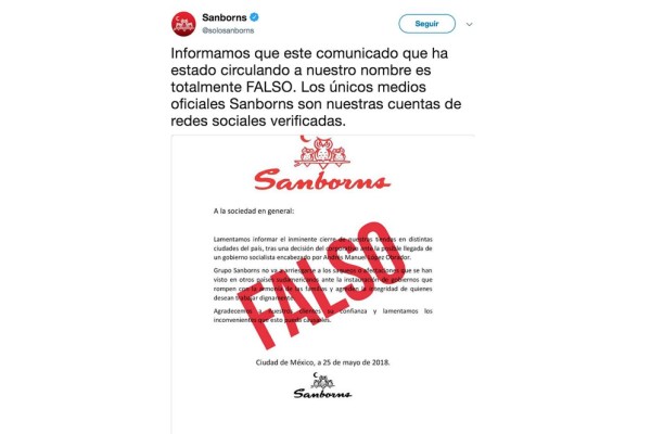 Sanborns también negó que fuera suyo un comunicado que circuló a su nombre en el que se informa de un supuesto cierre inminente de tiendas “ante la posible llegada de un gobierno socialista encabezado por Andrés Manuel López Obrador”. En la carta, que lleva el logo de la empresa, se añade: “Grupo Sanborns no va a arriesgarse a los saqueos o afectaciones que se han visto en otros países sudamericanos ante la instauración de gobierno que rompen con la armonía de las familias".