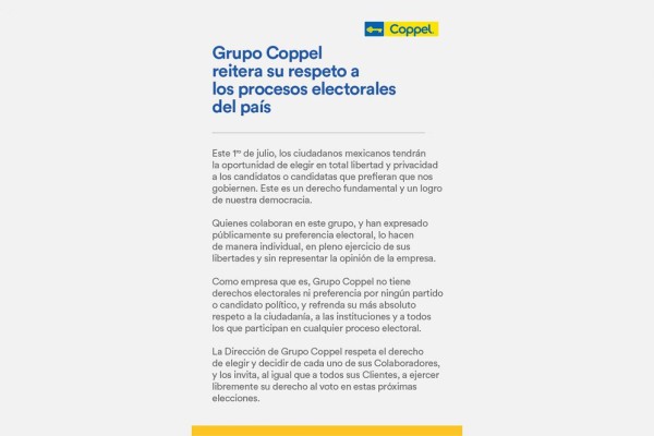"Como empresa que es, Grupo Coppel no tiene derechos electorales ni preferencia por ningún partido o candidato político, y refrenda su más absoluto respeto a la ciudadanía, a las instituciones y a todos los que participan en cualquier proceso electoral", se profundiza.