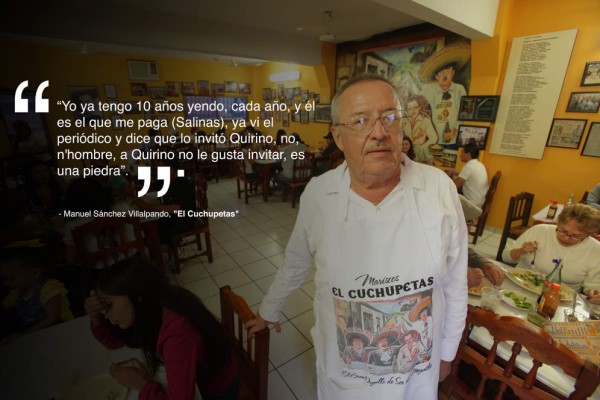 El empresario restaurantero Manuel Sánchez Villalpando, más conocido como “El Cuchupetas”, negó que el Gobernador Quirino Ordaz Coppel le haya pagado por una cena de mariscos para el ex Presidente Carlos Salinas de Gortari, quien celebró su cumpleaños 70 en su domicilio de la Ciudad de México.