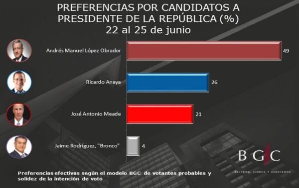 La Consultoría BGC Beltrán y Asociados dio a conocer los resultados de su más reciente encuesta presidencial, en la que Andrés Manuel López Obrador, candidato de la coalición Juntos Haremos Historia -entre el Movimiento de Regeneración Nacional (Morena), Partido del Trabajo (PT) y el Partido Encuentro Social (PES)-, cuenta con el 49 por ciento de las preferencias efectivas.