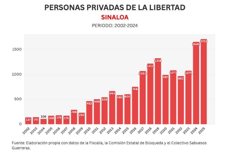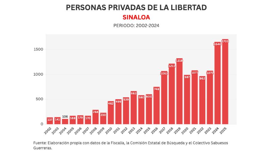 Con mil 703 denuncias al cierre del tercer trimestre de 2025, Sinaloa ya supera a todo el 2024 en denuncias por privaciones ilegales de la libertad, cuando se presentaron mil 646 casos, según datos obtenidos de la Fiscalía Sinaloa a través del Consejo Estatal de Seguridad Pública y solicitudes de información de Noroeste.