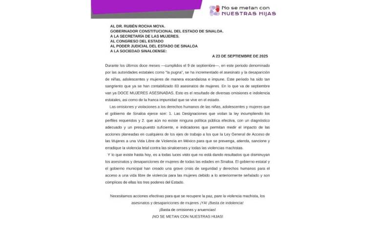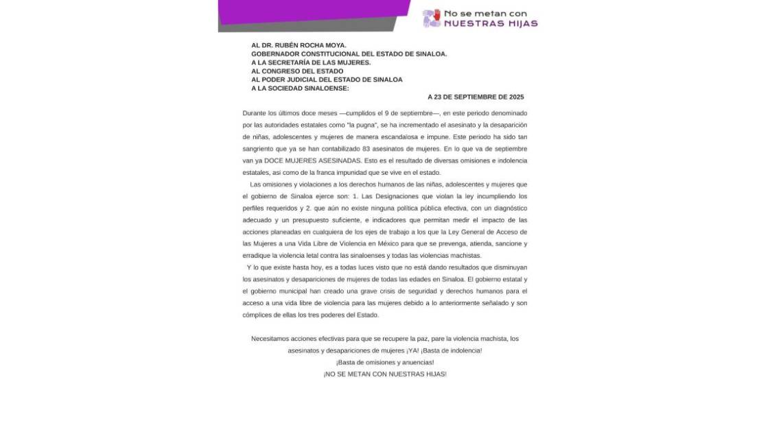 En un pronunciamiento dirigido al Gobernador Rubén Rocha Moya, a la Secretaría de las Mujeres, al Congreso local y al Poder Judicial, señalaron que en este lapso se han contabilizado 83 asesinatos de mujeres, de los cuales 12 ocurrieron solo los que va septiembre de este 2025.