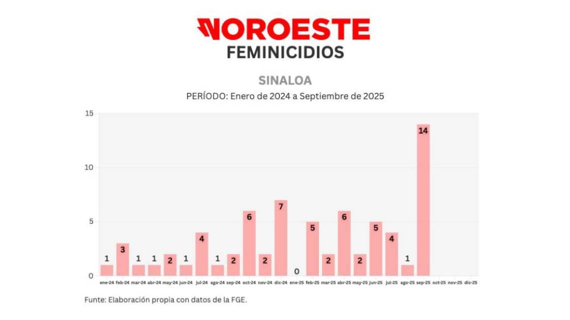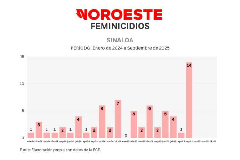 La estadística oficial señala que septiembre cerró con 128 homicidios dolosos, mientras que el registro de Noroeste contabilizó 146. De estos, 140 corresponden a asesinatos directos y seis a hallazgos de osamentas o restos humanos en distintos puntos del estado. Los 14 feminicidios forman parte de esta cifra global registrada en la entidad.