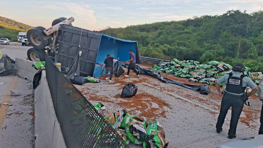 Efectivos de la Guardia Nacional abanderaron la zona del accidente y resguardaron la mercancía regada para evitar así actos de rapiña.