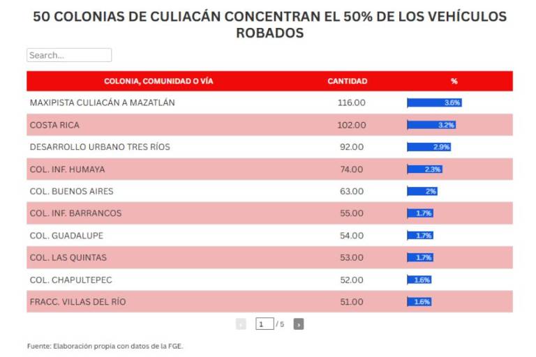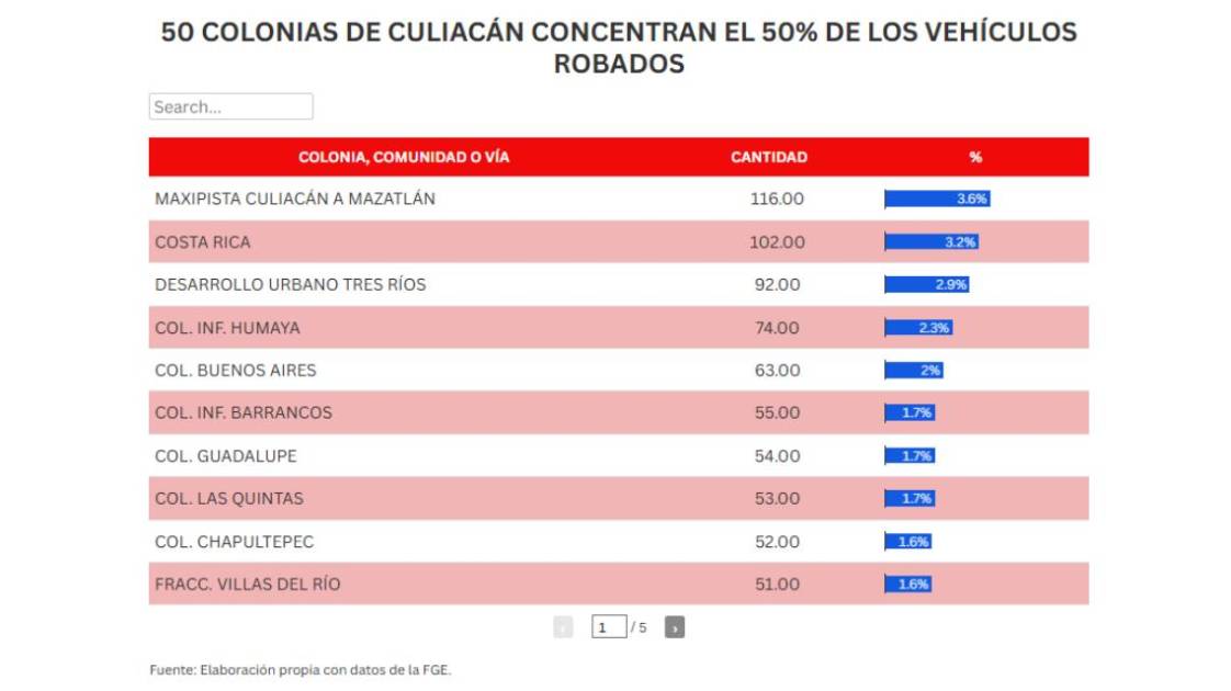 Desde el pasado 9 de septiembre, en Sinaloa se han registrado más de 5 mil robos de vehículos; 3 mil 193 de ellos han ocurrido en colonias, comunidades y vías de comunicación del municipio de Culiacán, lo que equivale al 60 por ciento del total.