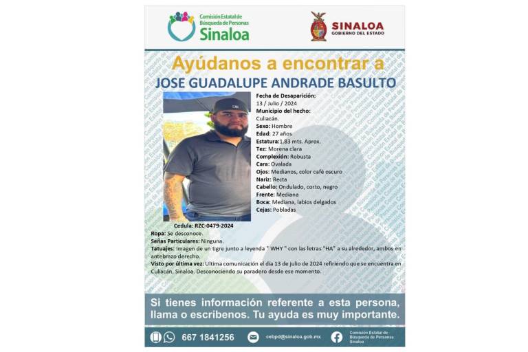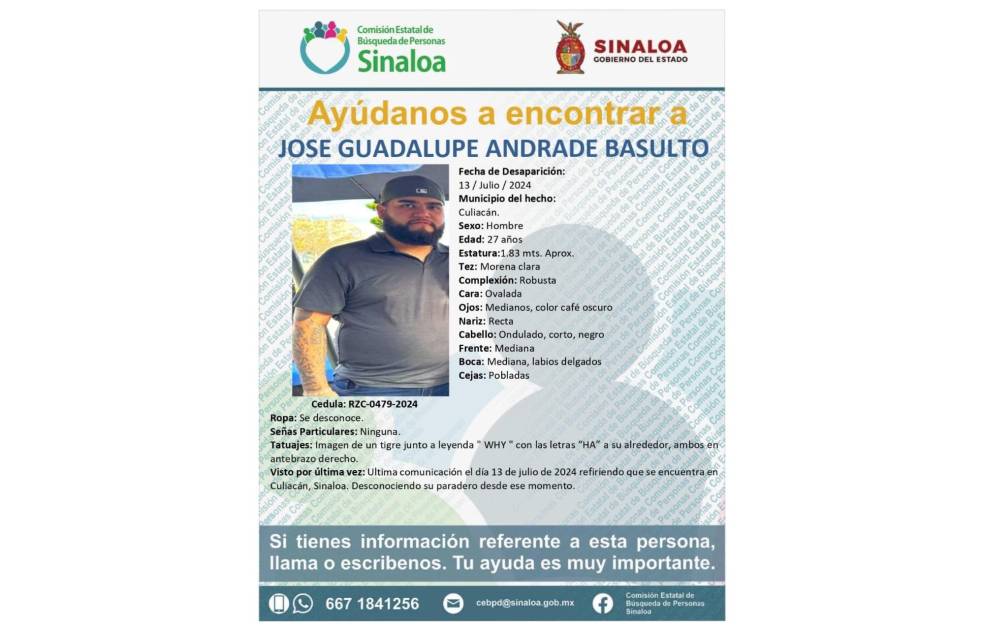 CULIACÁN._ Desde hace más de un año, a José Guadalupe Andrade Basulto lo busca su familia sin descanso, tras perder contacto con él el 13 de julio de 2024 en Culiacán.