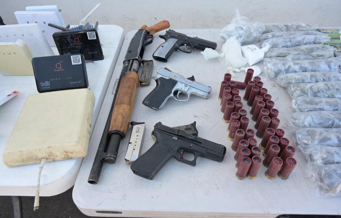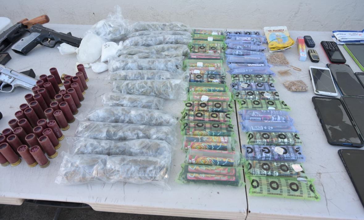 Durante esta revisión, las autoridades aseguraron una escopeta calibre 12, tres pistolas calibre 9 mm, cinco cargadores, 63 cartuchos de 9 mm y 44 cartuchos calibre 12. En cuanto a sustancias ilícitas, fueron decomisados 14 envoltorios de marihuana, tres bolsas con polvo blanco (aparentemente cocaína), 52 cigarros de marihuana, dos bolsas con semillas de cannabis y cinco dispositivos de vapeo.