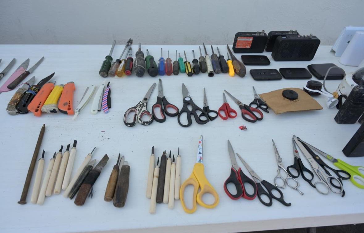 Además, se localizaron 89 teléfonos celulares, tres dispositivos de banda ancha móvil, 12 módems, 19 memorias USB, 11 tarjetas telefónicas, siete radios de comunicación, así como diversos objetos punzocortantes: 39 cuchillos, 18 puntas hechizas, 17 desarmadores, 15 tijeras y ocho navajas.