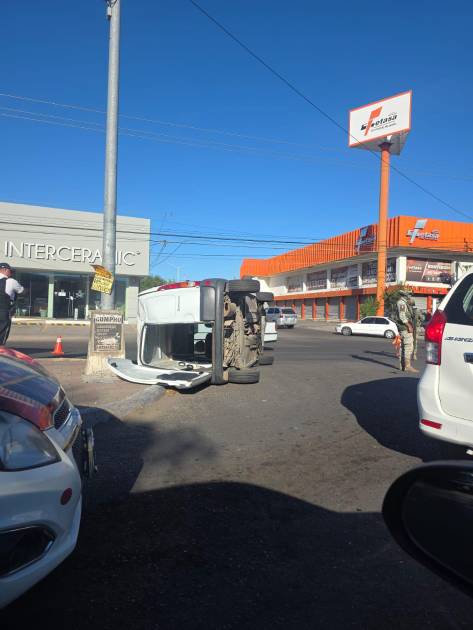CULIACÁN. _ Un vehículo de carga tipo furgoneta terminó volcado sobre la Calzada Heroico Colegio Militar, al sur de Culiacán, durante la mañana de este miércoles 15 de abril.