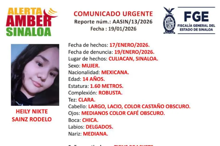 La Fiscalía General del Estado de Sinaloa emitió una Alerta Amber tras la desaparición de Heily Nikte Sainz Rodelo, de 14 años de edad, quien fue vista por última vez el pasado 17 de enero en la zona norte de la ciudad.