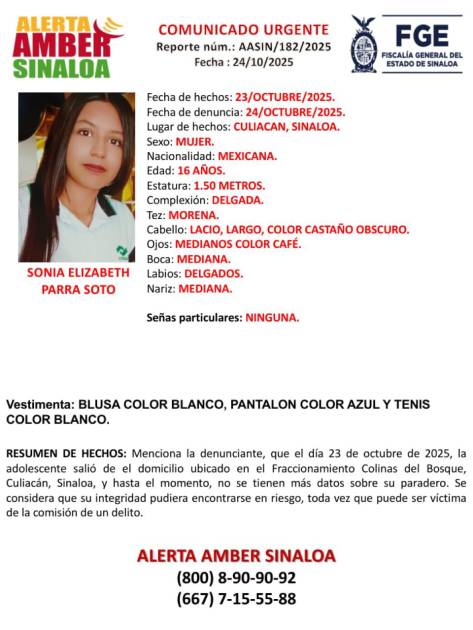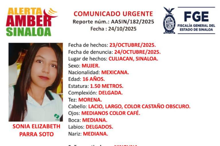 CULIACÁN. _ La Fiscalía General del Estado de Sinaloa activó la Alerta Amber para la localización de Sonia Elizabeth Parra Soto, de 16 años de edad, quien fue reportada como desaparecida desde el pasado 23 de octubre de 2025 en Culiacán.